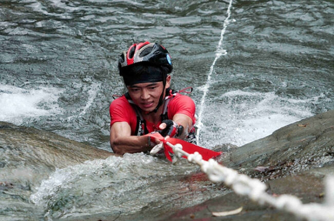 ? ? 40公里溯溪越野個(gè)人賽男子前三名分別為:王治虎(貴州,4小時(shí)05分54秒)、駱滔(貴州,4小時(shí)07分16秒)、岑萬江(浙江,4小時(shí)10分16秒) 程斌 攝