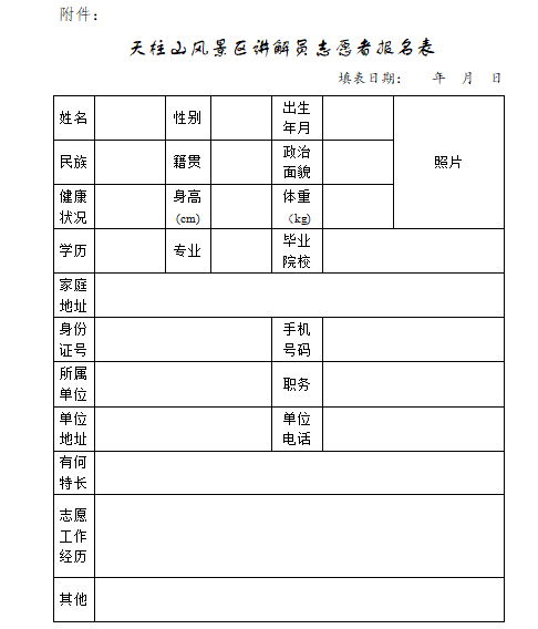 ? ? ? ? 1.《天柱山風景區(qū)講解員志愿者報名表》(見附件);