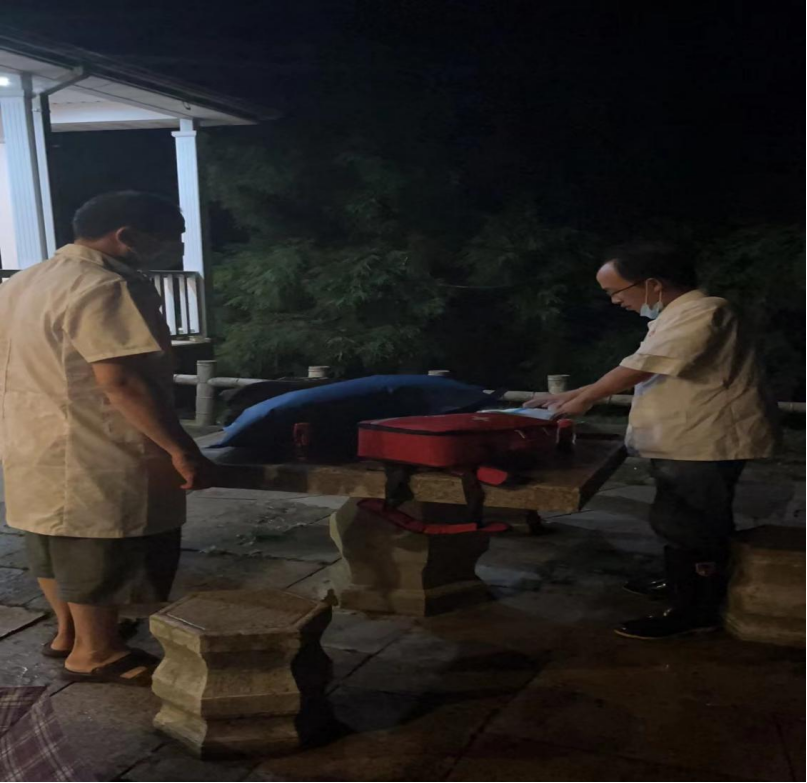 得悉萬女士的緊急狀況,指導(dǎo)員第一時(shí)間聯(lián)系了景區(qū)綜合執(zhí)法大隊(duì)大隊(duì)長劉運(yùn)中,劉運(yùn)中接到匯報(bào)后立刻安排天柱山急救站醫(yī)護(hù)人員與執(zhí)法隊(duì)員、景區(qū)派出所工作人員一起前往煉丹湖接待中心進(jìn)行救助,安排客運(yùn)公司人員駕駛急救車輛在大龍窩游客出口待命,同時(shí)向景區(qū)管委會相關(guān)領(lǐng)導(dǎo)和市疫情防控指揮部進(jìn)行了匯報(bào),并奔赴景區(qū)現(xiàn)場指揮救助。于是,雷雨交加的景區(qū)山徑夜幕中就出現(xiàn)了一群打著手電筒行色匆匆的一群人。