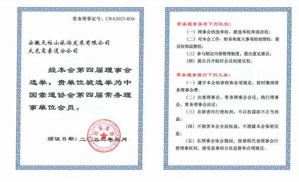 安徽天柱山旅游發(fā)展有限公司大龍窩索道分公司成為中國索道協(xié)會常務(wù)理事單位之一,是天柱山大龍窩索道發(fā)展史上重要的一步,有利于促進(jìn)天柱山大龍窩索道與中國索道協(xié)會及相關(guān)企業(yè)的交流與合作,促進(jìn)行業(yè)協(xié)會的資源共享和優(yōu)勢互補(bǔ),進(jìn)一步拓展大龍窩索道在索道技能項目領(lǐng)域的專業(yè)度、創(chuàng)新性和影響力。同時,大龍窩索道作為常務(wù)理事單位,也將積極履行職責(zé)和義務(wù),促進(jìn)組織發(fā)展和提高人才資源素質(zhì)。發(fā)揮天柱山大龍窩索道在索道協(xié)會常務(wù)理事單位職能,助推中國索道行業(yè)的高質(zhì)量發(fā)展具有里程碑的意義。(文:汪全龍)