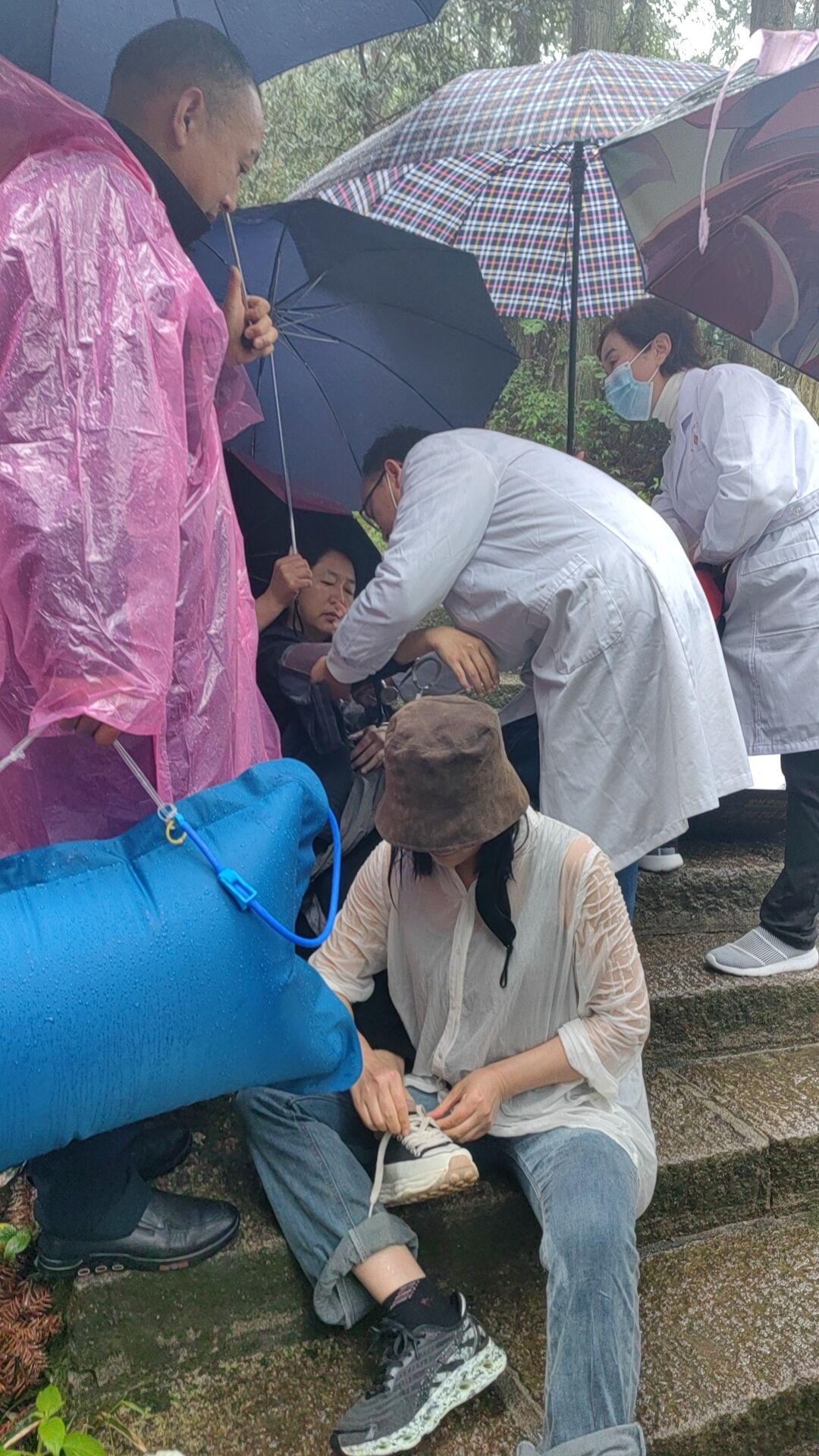 此時(shí)此刻,一場(chǎng)與時(shí)間賽跑的急速救援的暖心一幕,在天柱山景區(qū)真實(shí)上演。到達(dá)救援現(xiàn)場(chǎng),游客高女士呈現(xiàn)心慌、四肢無(wú)力、全身發(fā)抖、不能言語(yǔ)、時(shí)有惡心等狀態(tài),醫(yī)生給游客認(rèn)真仔細(xì)地做了檢查,表示情況十分危急,需及時(shí)到山下醫(yī)院就診。劉星第一時(shí)間撥通120急救電話,隊(duì)員汪小曲冒雨把高女士從迎真峰背負(fù)至牧羊河索道上站,路程約四五百米,然后坐索道下山并將游客抬上救護(hù)車,送往潛山市中醫(yī)院就診,稍微歇停背負(fù)的汪小曲,已累得癱軟一旁,站立不穩(wěn)。